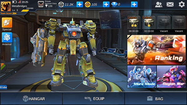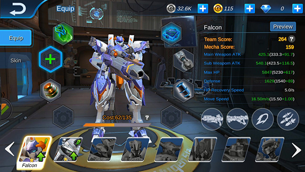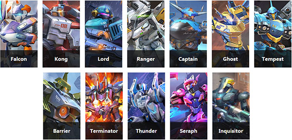 หุ่นยนต์ทั้งหมดในเกมนี้ แต่ละตัวจะมีหน้าที่ในสนามแตกต่างกันออกไป โดยตัว Falcon และ Ranger จะเป็นตัวพื้นฐานให้ได้เล่นกัน ส่วนตัวอื่นๆสามารถหาซื้อได้ด้วยเงินจริง การสุ่มกาชา หรือการปลดล๊อกหลังเล่นจบเนื้อเรื่อง และหุ่นแต่ละตัวก็จะมีการอัพเลเวล อัพเกรดรูปร่างภายนอกทุกๆ10เลเวล รวมไปถึงสกินเสริมสมรรถนะด้วย