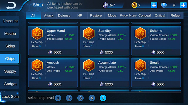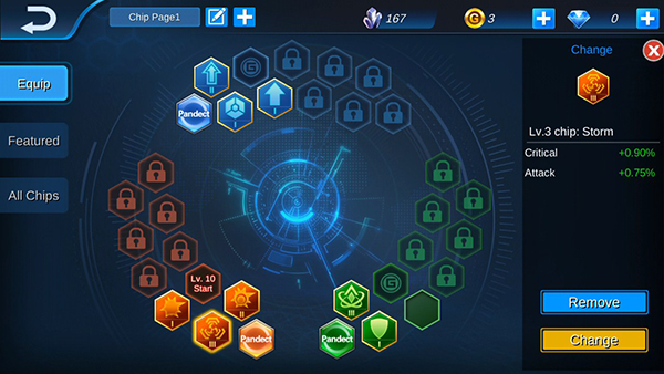 การฝังชิปในเกมนี้ จะเหมือนการ “การใส่รูนในเกม ROV” ทุกประการ หุ่นยนต์แต่ละแบบก็จะมีความต้องการ “ชิปที่ตรงสาย” เช่น Falcon เป็นหุ่นสายยิงไกล – กลาง ต้องการชิปเสริมระยะยิง และความเร็วกระสุนมากกว่าการเพิ่มรูนเสริมพลังโจมตีประชิดนั่นเอง ซึ่ง ชิปแต่ละเลเวล สามารถหาซื้อได้ด้วย Earth Meterial ที่ได้จากการเล่นเนื้อเรื่อง หรือการสุ่มกาชา และยิ่งเลเวลสูง ราคายิ่งโหดร้ายมาก