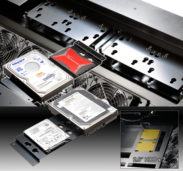 ตัวเคสมีช่องใส่ HDD ที่มีให้มากถึง 8 ช่อง อัพเกรดกันสนุกมือเลย โดยจะเป็นการรองรับ HDD แบบขนาด 3.5 และ 2.5 และยังเพิ่มช่อง HDD 2.5 เพิ่มอีก 2 ช่อง