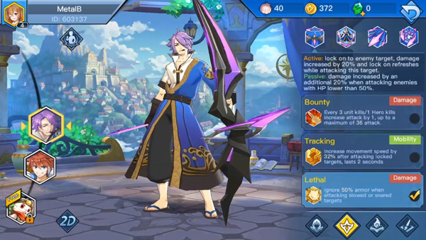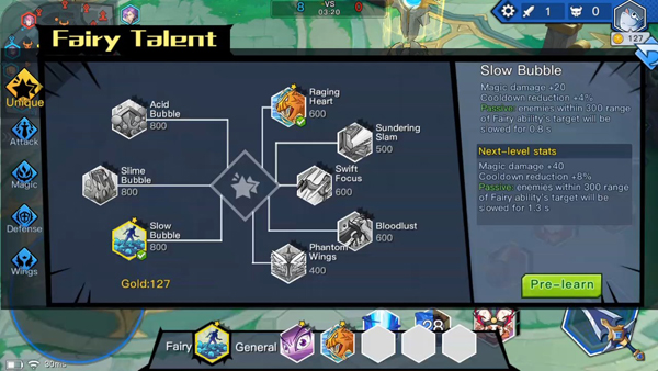 อันนี้ก็จะเหมือนกับการออกของออกไอเทมเกมMoba โดยจะแบ่งออกเป็น 4 สาย ได้แก่ Attack / Magic / Defense / Wing แต่จะถูกล๊อกสเปคไว้ในรูปแบบของผังสกิลติดตัวแทน แน่นอนว่าฮีโร่แต่ละตัว จะมีผังสกิลติดตัวที่ต้องซื้อในแมทช์การเล่นต่างกันไป…