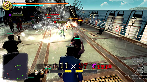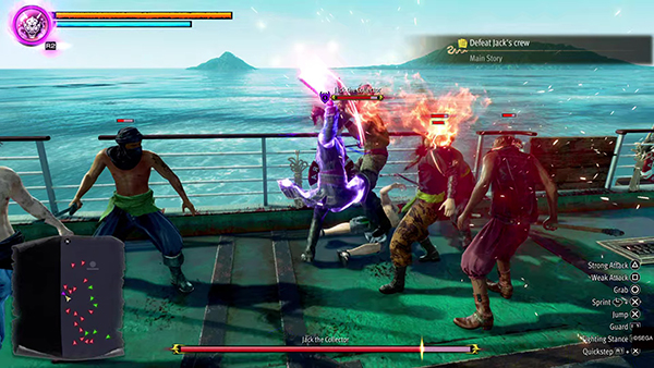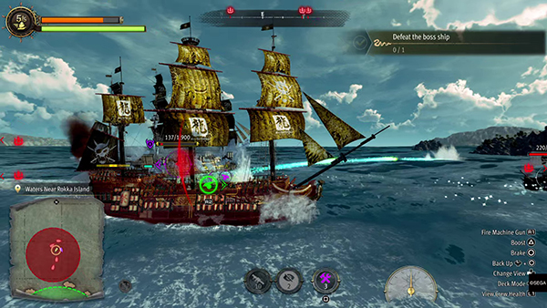 เมื่อเรือโจรสลัดของศัตรูเล็งคุณไว้ การต่อสู้ด้วยปืนใหญ่แบบเรียลไทม์อันน่าตื่นเต้นก็เกิดขึ้น เคลื่อนพลอย่างรวดเร็วไปยังตำแหน่งต่างๆ โดยหลบลูกปืนใหญ่ จากนั้นสวนกลับด้วยการสร้างความเสียหายอย่างรุนแรงเพื่อขึ้นเรือของศัตรูและจัดการกับกัปตันในการต่อสู้แบบยกทัพลูกเรือเข้าประจันบาน พิชิตท้องทะเล ค้นหาเกาะลับที่ซ่อนอยู่ และรับของปล้นมากมายเหมือนโจรสลัด ในสไตล์ยากูซ่า
