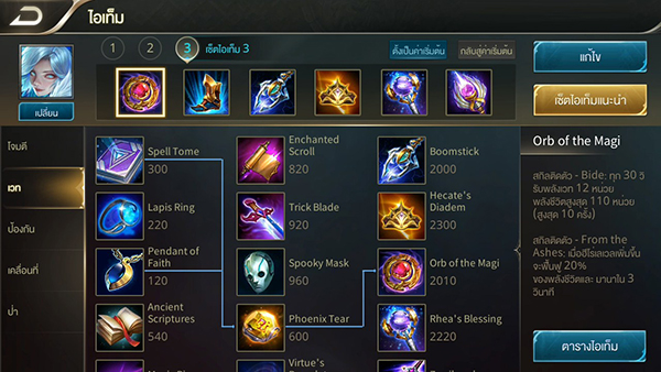 เริ่มต้นออก Orb Of the Magi ลดคูลดาวน์ เพิ่มพลังเวทย์ และฟื้น HP ในช่วงเลเวลอัพ เป็นของที่จำเป็นที่สุดในช่วงต้นเกม แล้วต่อด้วยรองเท้า Gilded Greaves ช่วยให้วิ่งเร็วเสริมเกราะเวทย์และป้องกันสถานะเพื่อช่วยในจังหวะที่จะหนีออกจากกลางวงไฟต์ Hecate’s Diadem , คฑา Rhea’s Blessing เพิ่มความแรงโจมตีเวทย์เสริมโล่และดูดเลือด Staff of Nuul เพื่อเสริมความแรงเวทย์เจาะเกราะ และกันตาย ออกของตามนี้จะทำให้ ลิเลียน่า โหดทั้งในร่างคนและ9หาง
