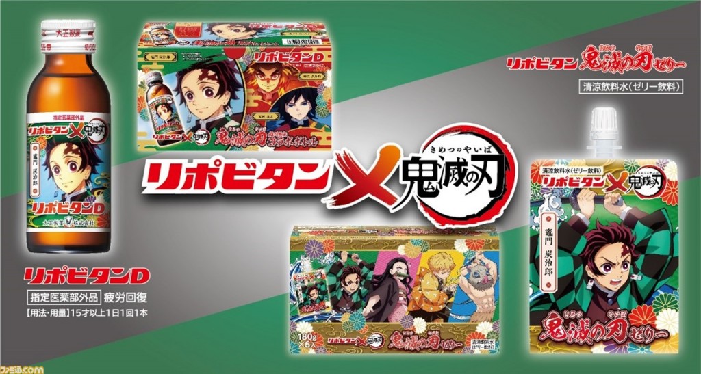 โดยทาง Taisho Pharmaceutical Co., Ltd. ได้เตรียมออกผลิตภัณฑ์จำกัดจำนวน “ขวด Lipovitan D + Kimetsu no Yaiba” (ขวดลิโพไยบะ)และ “Lipovitan Kimetsu no Yaiba Jelly” เยลลี่ไยบะชูกำลัง จะวางจำหน่ายตั้งแต่วันที่ 17 มกราคม 2022 เป็นต้นไป