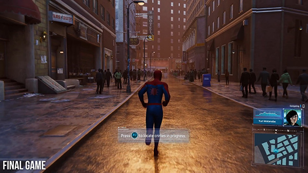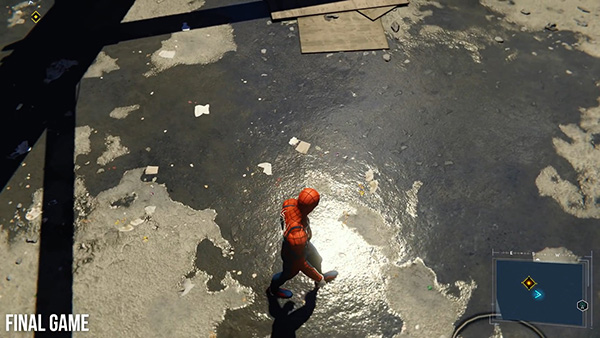 -จุดที่ชัดมากๆคือ “ชุดของสไปเดอร์แมน” ที่ได้มีการลงรายละเอียดของชุดที่ต่างไปจากเวอร์ชั่นงาน E3 2017 ที่ไม่ค่อยจะสะท้อนแสง หรือดูมันวาวเท่า ซึ่งทีมพัฒนาตั้งใจ เพราะเชื่อว่ามันออกมาสวยกว่า ดูดีกว่า ไม่มีผลทางเทคนิค หรือสเปคเครื่อง PS4แต่อย่างใด