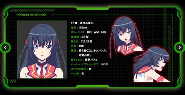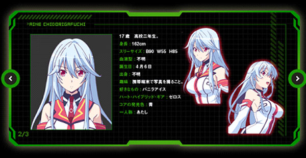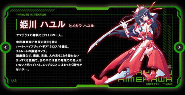 นักเรียนหญิงปีสองของโรงเรียนยุทธศาสตร์การป้องกัน “Ataraxia” ปี 2 สมาชิกทีม “Ataramasu” เธอมีความสามารถในการขับ HHG (Heart Hybrid Gear) ระดับ S ซึ่งมันเป็นระดับที่ดีมาก ทำให้กลายเป็นพวกมั่นใจในตัวเองอยู่พอสมควร และเป็นคนที่ปากไม่ค่อยตรงกับใจ