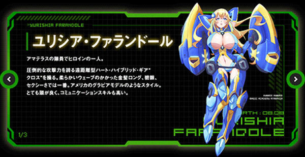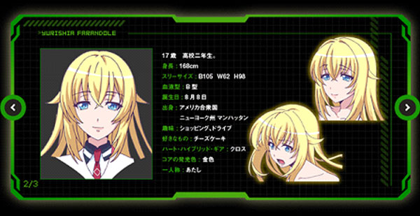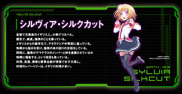 นักเรียนหญิงปีสองของโรงเรียนยุทธศาสตร์การป้องกัน“Ataraxia” ปี 2 ห้อง 1 สมาชิกทีม “Ataramasu” เธอมีความสามารถในการขับ HHG (Heart Hybrid Gear) ระดับ S เช่นกันเป็นผู้ที่มีความสามารถของฝั่งอเมริกา เธอเป็นคนที่เสน่ห์และฮิตมากในหมู่สาวๆ