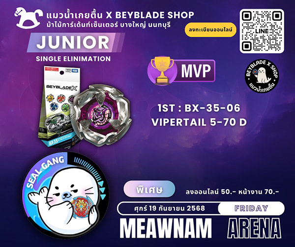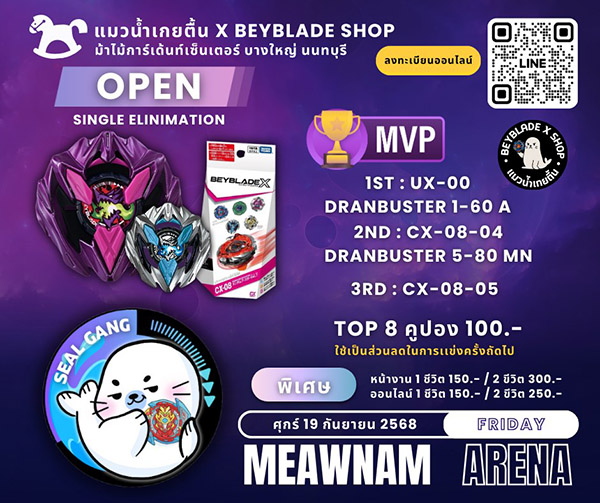 อย่ารอช้า! มาสนุกและแสดงพลังเบย์เบลดของคุณที่ Meawnam Arena แล้วมาดูกันว่าใครจะเป็นเจ้าแห่งสังเวียนในสัปดาห์นี้!