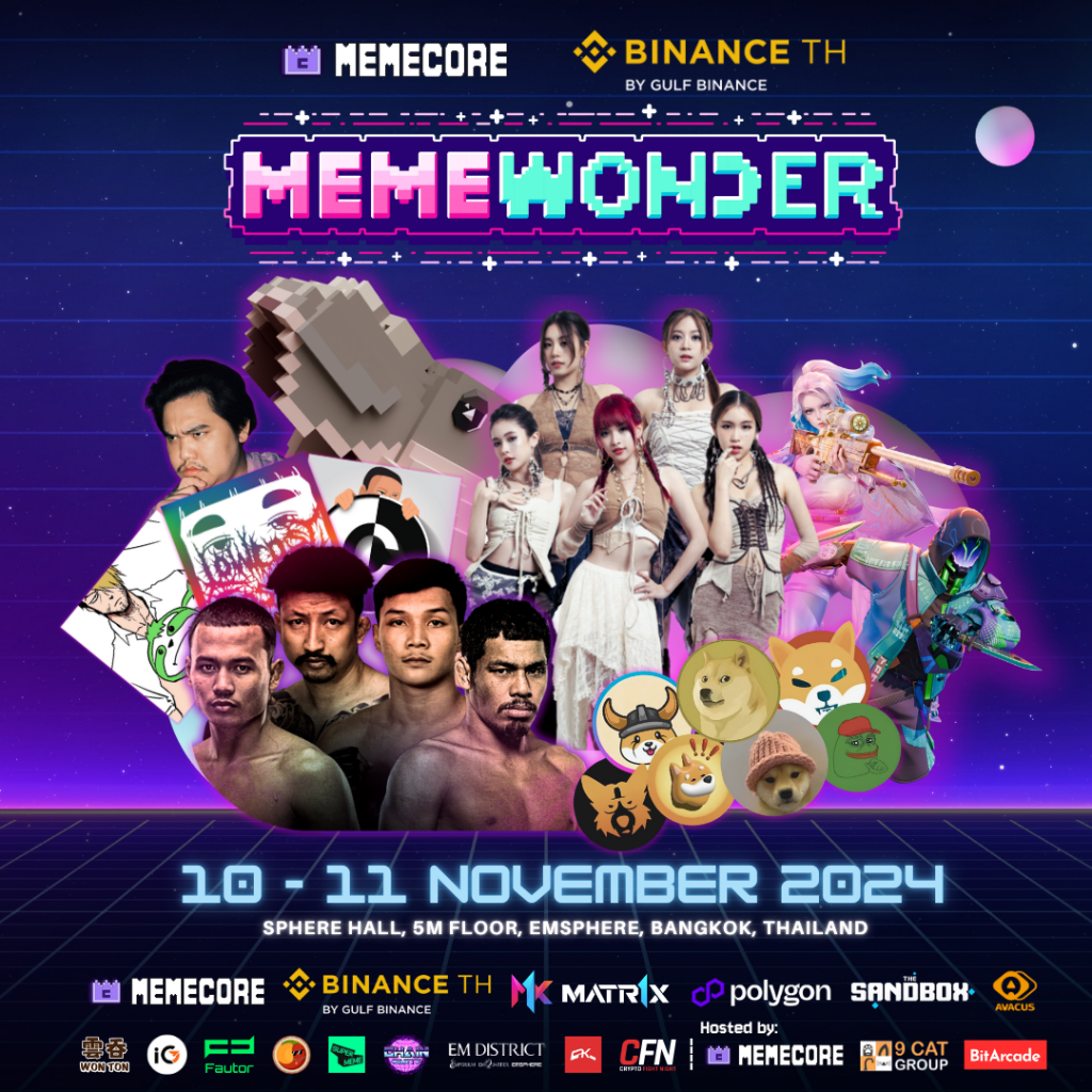 วันที่ 29 ตุลาคม 2567 - Binance TH จับมือ MemeCore พร้อมด้วย 9 Cat Digital Group และ BitArcade ในฐานะผู้จัดงาน เปิดตัว MemeWonder งาน Memetertainment ครั้งแรกในเอเชีย พบกับทอลค์จากสปีคเกอร์ระดับโลกทั้งจากวงการเทคโนโลยี การเงิน และเอนเตอร์เทนเมนท์ ในวันที่ 10-11 พฤศจิกายนนี้ ณ Sphere Hall ชั้น 5M ห้างสรรพสินค้า EMSPHERE กรุงเทพฯ ประเทศไทย ซึ่งถือเป็น Official Partner ของ Thailand Blockchain Week 2024 งานเปิดโลกการลงทุนและเทคโนโลยีแห่งโลกดิจิทัลซึ่งจัดขึ้นต่อเนื่องเป็นปีที่ 7 ในปีนี้