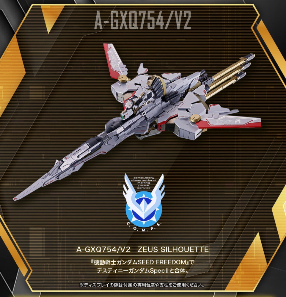 “ZEUS SILHOUETTE “ สามารถแปลงร่างเป็น MA หรือ จะรวมกับหุ่นในสเกล METAL ROBOT SPIRITS (หรือ1/144) ร่างยาน มีความยาว 450 มม. มาพร้อมแท่นดิสเพลย์ นอกจากนี้ยังสามารถใช้ร่วมกับ “METAL ROBOT SPIRITS <SIDE MS> DESTINY GUNDAM SpecⅡ (จำหน่ายแยกต่างหาก)” เพื่อทำร่างใหม่แบบในอนิเมะได้