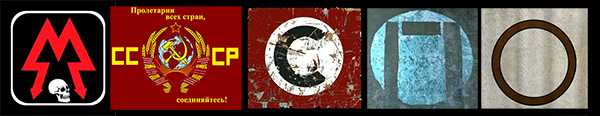 สัญลักษณ์เรียงจากซ้ายไปขวา Rangers / Red Line / Fourth Reich (ในนิยายใช้ตราสวัสดิกะ 3ขา) / Polis / Hanza