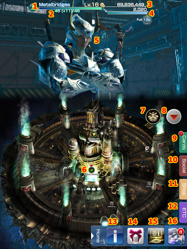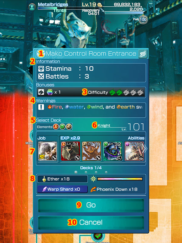 6. แผนที่ภายในเกม แม็ปจะเปิดขึ้นทุกๆ ครั้งที่ผู้เล่นสามารถเคลียร์ด่านต่างๆ ในเกมนี้ ซึ่งด่านแต่และด่านจะมีค่าความต้องการของเกจสตามิน่าที่ไม่เท่ากัน สามารถเล่นด่านนั้นซ้ำอีกรอบได้