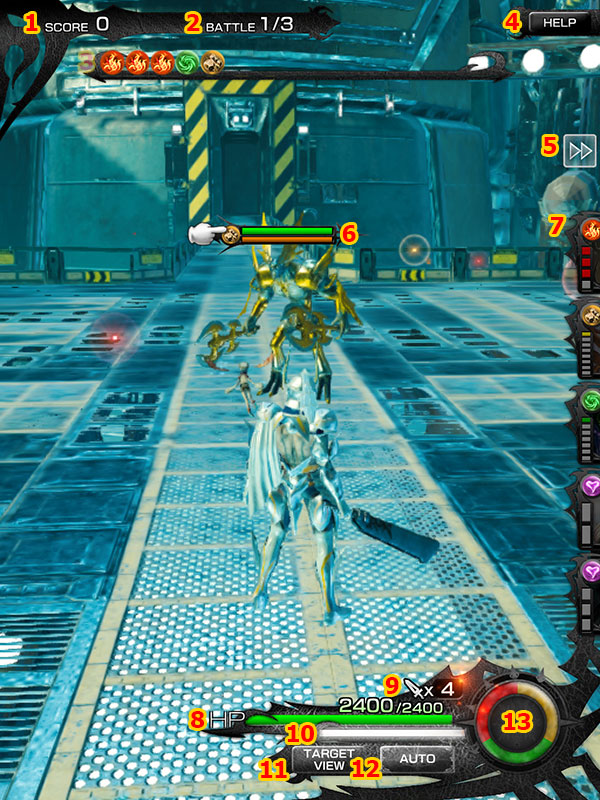 5. เกจสถานะพลังของศัตรู แถบสีเขียวคือ HP ของศัตรู ส่วนแถบสีส้มคือเกราะ เมื่อทำการโจมตีใส่ศัตรู ค่า HP และเกราะของศัตรูจะลดลงพร้อมๆ กัน โดยหากเกราะของศัตรูถูกทำลายตั้งแต่แถบสีส้มจนกลายเป็นสีแดงจนหมดลง ศัตรูจะติดสถานะ Break และโดนโจมตีเข้าแถบ HP ได้โดยตรงในช่วงเวลาหนึ่ง จนกว่าเกราะของศัตรูจะพื้นคืนกลับมา หรือตายในการต่อสู้