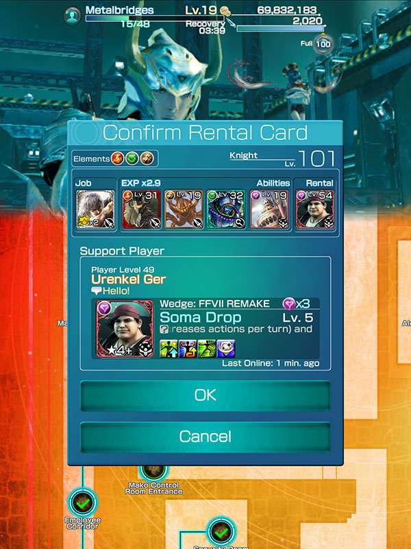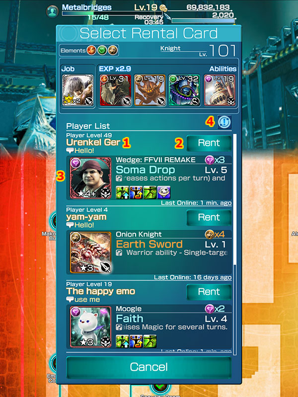 จากนั้นจะมีหน้าจออินเตอร์เฟส Select Rental Card ขึ้นมา ซึ่งจะเป็นการ์ดของผู้เล่นคนอื่นๆ ใช้สำหรับการช่วยเหลือเพื่อการเล่นที่ง่ายขึ้น ผู้เล่นสามารถเลือกการ์ดของผู้เล่นคนอื่นตามต้องการโดยที่ไม่เสียค่าใช้จ่ายอะไรเลย