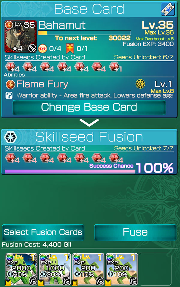 แต่หากเลเวลของ Ability ยิ่งสูง อัตราการสำเร็จก็จะมีเปอร์เซ็นต์ที่ลดลง ผู้เล่นสามารถใช้การ์ดวัตถุดิบ (Materia Card) เพื่อเพิ่มอัตราการสำเร็จในการฟิวชั่นได้เช่นกัน อย่างเช่นการ์ด Mog Amulet