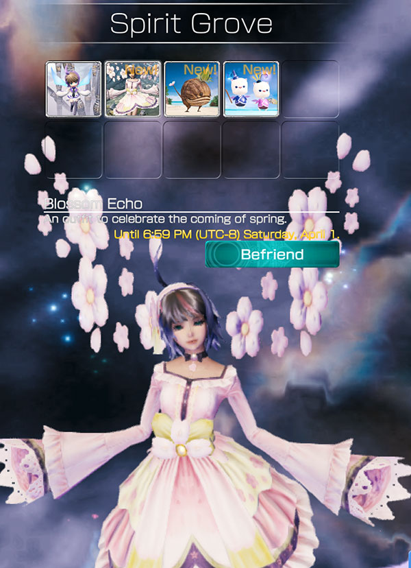 นอกจากนี้ผู้เล่นยังสามารถแต่งตัวให้กับเธอได้ด้วยตั๋วที่ชื่อ Spirit Tickets แต่ไม่เพิ่มคุณสมบัติใดๆ