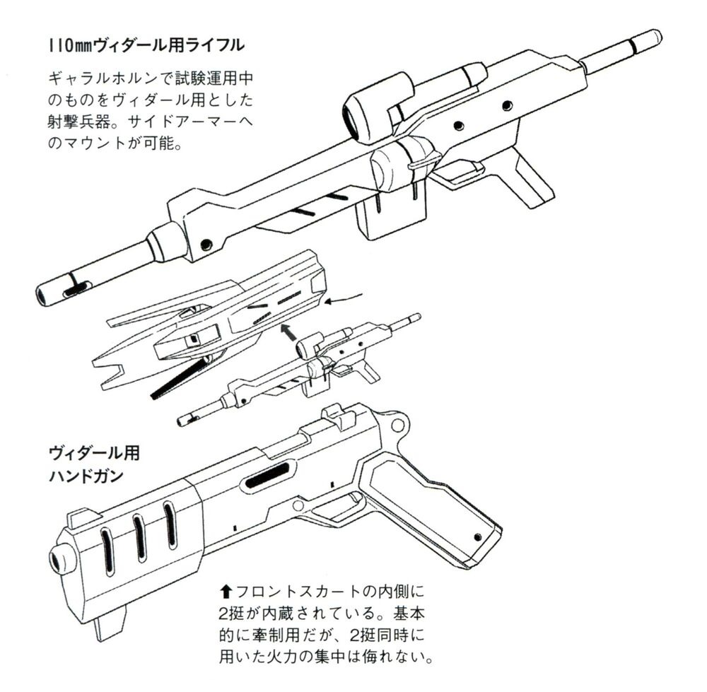 นอกจากกระบี่ฝังระเบิดแล้ว ยังมี “ปืนฃไรเฟิลรุ่นต้นแบบของกัลลาฮอร์น” ติดตั้งด้วย โดยระหว่างการใช้งานของกันดั้มวีด้าร์ จะเป็นการเก็บข้อมูลการพัฒนาอาวุธชนิดนี้ก่อนที่จะนำไปพัฒนาเป็นรุ่นผลิตจำนวนมากต่อไป…