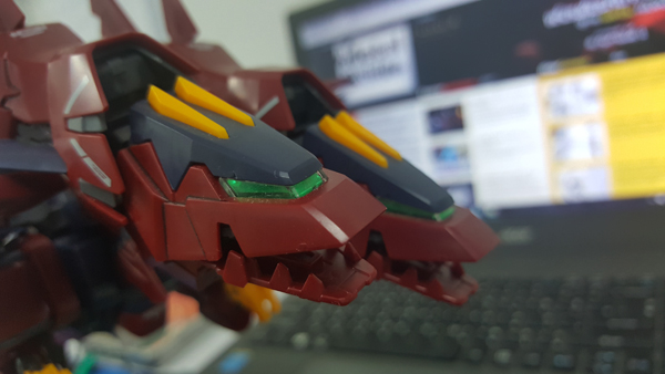 ส่วนขาจะเหมือนกับตัวครับ เพราะมีเฟรมในกับเฟรมนอกที่เป็นเกราะ สามารถต่อแต่เฟรมในแล้วเอามายืนเท่ๆได้เลยครับ แต่เวลาต่อต้องระวังพวกข้อต่อดีๆ เพราะว่าส่วนนี้เป็นส่วนที่ใช้เป็น “คอ” ของมังกรเวลาแปลงร่างแล้ว ถ้าต่อผิดนี่รื้อยาวแน่นอน