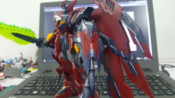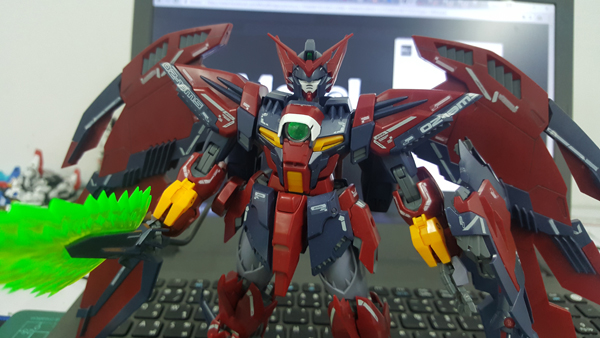 อาวุธของเอเปี้ยนกันดั้มนั้นมีแค่ 2 อย่างคือ บีมเซเบอร์ และ แส้ความร้อน ตอนต่อไม่ยุ่งยากเท่าไรครับ แต่ชิ้นส่วนเยอะ ทำให้เสียเวลาตัวนานมาก!! แต่เมื่อต่อเสร็จแล้วบอกได้คำเดียวเลยครับ “โคตรเท่”