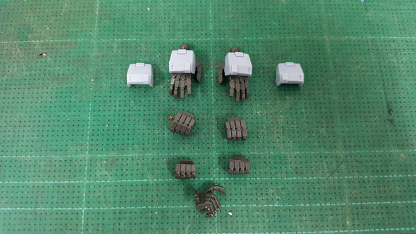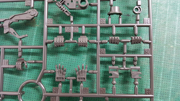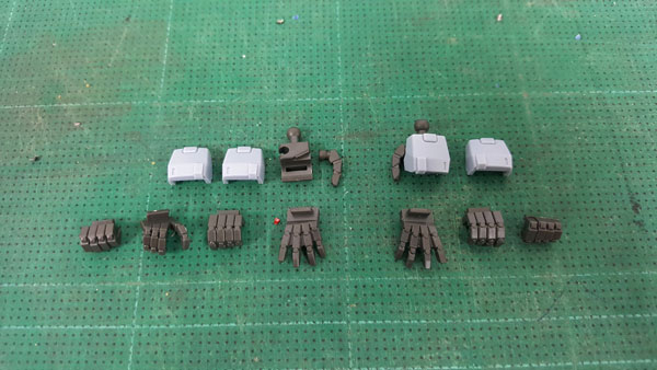 ชิ้นมือที่ให้มาจะมีทั้งหมด 7 ชิ้นครับ คือมือซ้าย-ขวา ที่เป็นแบบกำมือไปจนถึง แบบมือ แต่ก็จะมีอีกชิ้นที่เป็นชิ้นของมือข้างซ้ายที่เป็นมือแบบถือปืนนะครับ เอาไว้ถือปืนโดยเฉพาะ เพราะในชิ้นมือจะมีเดือยที่ใช้สำหรับเกี่ยวล๊อคกับตัวด้ามปืน
