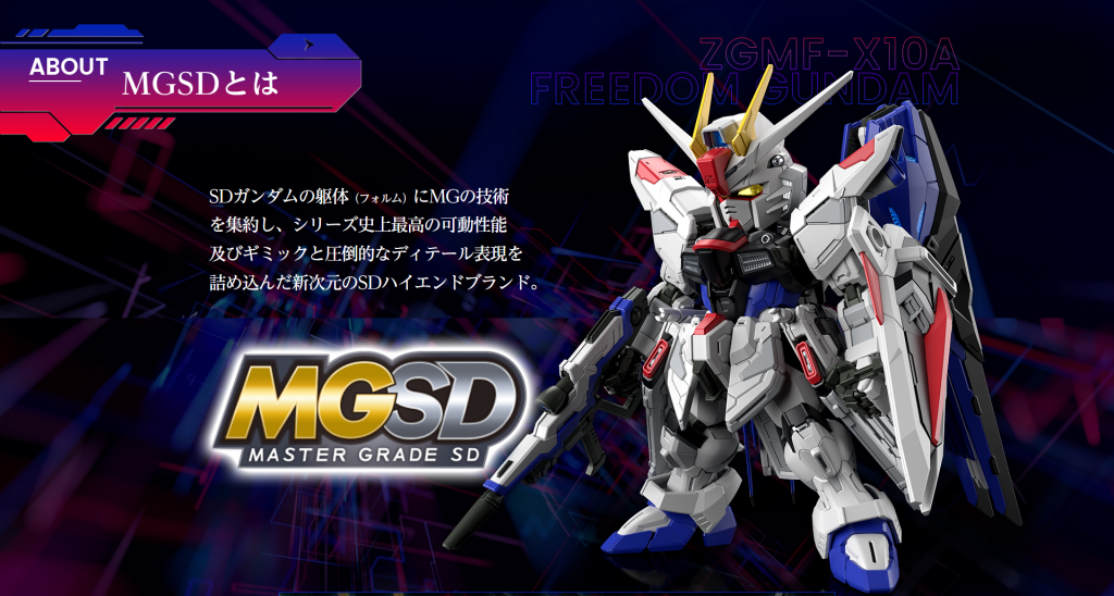 MGSD แบรนด์ SDกันดั้ม ระดับไฮเอนด์ มิติใหม่ที่ผสานรวม เทคโนโลยีของ MG เข้ากับโครงสร้างภายในที่มีชั้นเชิง มันจะเป็น SD Gundam ที่อัดแน่นด้วย ประสิทธิภาพของจุดขยับ ข้อต่อ กลไก และการแสดงรายละเอียด ที่บันไดเคลมว่า ” สุดในประวัติศาสตร์ของซีรีส์”