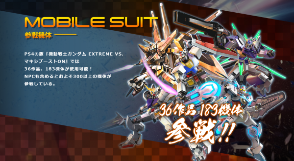 Mobile Suit Gundam Extreme VS. Maxiboost ON เกมแอคชั่นความเร็วสูง ที่ชี้เป็นตายในเสี้ยววินาทีภาคล่าสุด ผลงานจากทาง Bandai Namco ที่ส่งเหล่า MS ในเรื่องมาฟัดกันในสังเวียน PS4 ที่ยังคงระบบการต่อสู้ที่คุ้นเคย เป็นเกมที่มีเนื้อเรื่องสไตล์ยำใหญ่รวมญาติ เล่นเอามันส์เข้าว่าสถานเดียว โดยในภาคนี้จะเป็นการต่อสู้แบบ 2 vs 2 ทีมแบทเทิ่ล พร้อมกับโมบิลสูทจากจักรวาลกันดั้ม 183 ตัว จากกันดั้ม 36 เรื่อง (นับภาคหลัก ภาคเสริม ไซด์สตอรี่ทั้งหมด)
