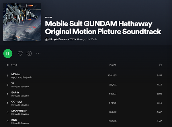 ไล่ตั้งแต่เพลงช่วงเปิดเรื่อง “Möbius” ที่ได้ร่วมงานกับ mpi, Laco, Benjamin, เพลงที่ขึ้นมาตอนกล่างเรื่อง ช่วงที่เกาแมนขับเมสเซอร์บริเวณน่านน้ำของดาเวา “TRACER” และที่ขาดไปไม่ได้เลยก็คือ OST ต่างๆตลอดทั้งเรื่อง ที่ไฮไลท์เลยก็คือเป็นซีนที่ XI ปะทะกับ Penelope อย่างเพลง “XI” และ “car5p3 / PENELOPE” สำหรับใครที่อยากตามไปย้ำฟัง ใน Youtube แชนเนล “澤野弘之 / SawanoHiroyuki[nZk]” มีลงไว้ เช่นเดียวกับแพล็ทฟอร์มอย่าง Spotify ก็มีให้ฟังแล้วครับ