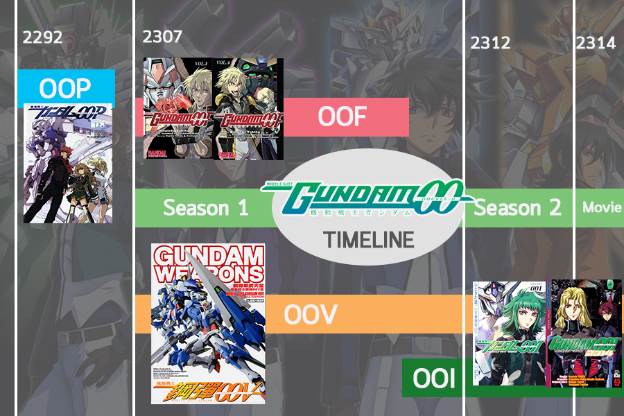 Gundam OO Side Stories เกือบทุกภาคนั้นเรียกได้ว่า ดำเนินเรื่องราวไปพร้อมๆกับพวก Setsuna และ Celestial Being ในภาคหลักเลย ซึ่งภาคเสริมนี้ก็จะมีการเจาะลึก เนื้อเรื่อง ภารกิจ ตัวละคร ที่ทีวีซีรีย์ไม่ได้ครอบคลุมไว้ ให้แฟนๆภาค OO ได้ทราบกัน หากเรียงกันตามไทม์ไลน์แล้ว ภาค OOF จะดำเนินเรื่องไปถึงช่วงไม่กี่ปีก่อนที่จะเริ่ม Gundam OO season 2 หลังจากจบภาค OOF ไปแล้ว(ตามมังงะ) ก็ได้ดำเนินเรื่องภาคเสริมต่อด้วย OOI ในเวลาที่ห่างกันไม่นานนัก