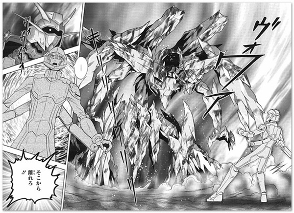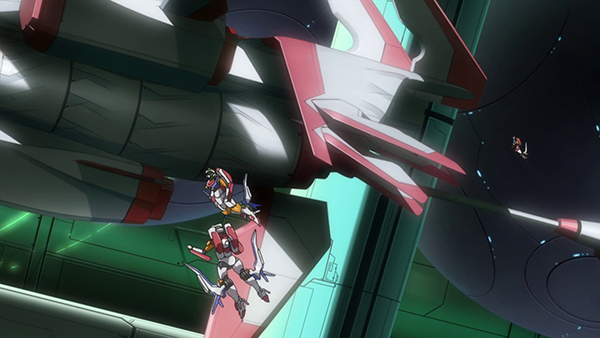 ทางลีโอ ก็ตัดสินใจไล่ตามไปสอยเครื่องบินด้วย “Arios Ascalon” จัดการสอยเครื่องบินตกโดย GN Sword ได้สำเร็จ แต่ตัวเขาไม่รู้เลยว่า ปลายดาบที่ได้สัมผัสกับ ELS นั้น เริ่มถูกกัดกินไปทีละน้อยแล้ว …
