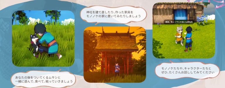 ผู้เล่นจะได้ผจญภัยไปพร้อมกับ ลูกหมา Musashi ที่น่ารักของคุณใน Open world แนว โร๊คไลท์ ที่เต็มไปด้วยสัตว์ร้ายและเทพเจ้าใน Mononoke no Kuni และจะต้อง ตกปลา ทำฟาร์ม และล่องเรือข้ามเกาะเพื่อสำรวจดินแดนต่างๆ ด้วย