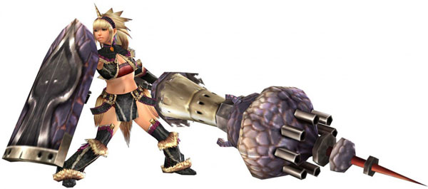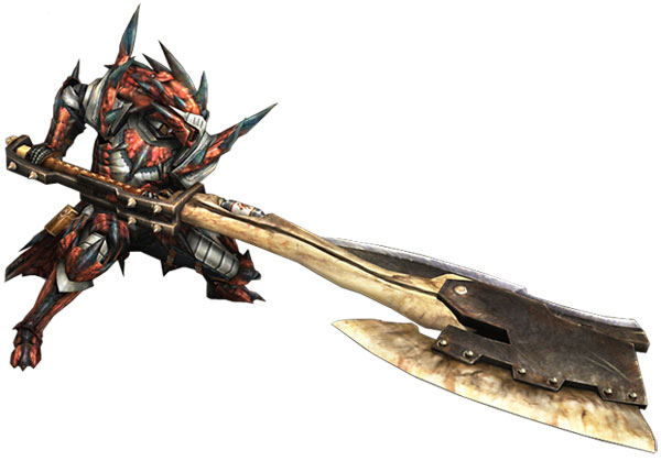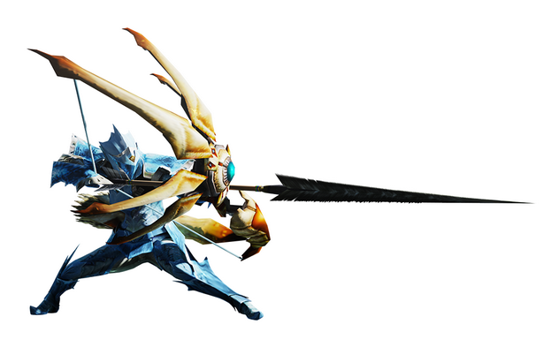 หอกยาวที่มาพร้อมดาเมจที่รุนแรงสะใจ เหวี่ยงไปมา สร้างเป็นคอมโบต่อเนื่องจนกว่าค่า Stamina จะหมด แต่ด้วยน้ำหนักที่มากทำให้การเคลื่อนไหวเชื่องช้า แต่ก็ชดเชยด้วยการสวิชเป็นดาบใหญ่ที่สร้างคอมโบได้รวดเร็วยิ่งขึ้น แถมยังสามารถชาร์ตพลังระเบิดที่รุนแรงได้อีกด้วย