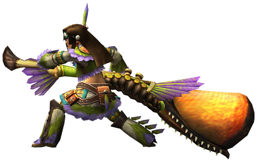 อาวุธที่ดูหน้าตาไม่เหมือนอาวุธ แต่กลับเป็นเครื่องมีช่วยเหลือในการต่อสู้ได้อย่างดี การหวดแต่ละแบบจะเกิดตัวโน๊ตที่แตกต่างกัน สร้างสรรค์เป็นทำนองเพลงเป็นการก่อกวนสัตว์ยักษ์ให้สับสน และยังช่วยสนับสนุนเพื่อนร่วมทีมให้ต่อสู้ได้ง่ายขึ้น