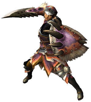 มือข้างหนึ่งถือดาบ มืออีกข้างถือโล่ เป็นชุดอาวุธพื้นฐานที่มีความสมดุลมากที่สุด สามารถโจมตีได้คล่องแคล่วรวดเร็ว และมีโล่ที่ใช้ป้องกันการโจมตีได้ เหมาะจะเป็นอาวุธสำหรับมือใหม่ที่ยังไม่คุ้นกับจังหวะของสัตว์ยักษ์
