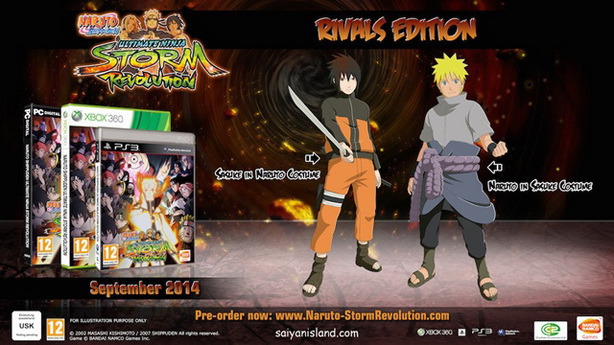 สำหรับชุดพิเศษชุดแรกนั้นมีชื่อว่า “Rivals Edition” ซึ่งเป็นชุด day 1 edition (ขายวันแรก ล๊อตแรกเท่านั้น) ที่ภายในจะบรรจุDLC เสื้อผ้าสองชุด โดยจะสลับกันให้นารูโตะมาใส่ชุดของซาสึเกะ และตัวซาสึเกะเองจะไปใส่ใส่เสื้อของนารูโตะแทน และทั้งสองชุดนี้จะไม่มีการนำกลับมาขายภายหลังในรูปแบบ DLC (อันนี้ทางผู้ผลิต ยืนยันออกมาแล้วครับ ว่าไม่มีการย้อมแมวในชุดนี้)