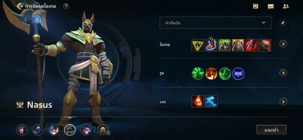 Item สำหรับ Nasus จะเน้นไปทางด้านของ การลด Cooldown ให้เต็ม40 และเน้นไปทางด้านความถึก เนื่องจาก Nasus เป็นตัวที่มีสกิล1ช่วงเลทเกมค่อนข้างแรงอยู่แล้ว จึงไม่จำเป็นต้องมีไอเทมเสริมดาเมจมากนัก แค่ยืนทำดาเมจให้ได้อย่างต่อเนื่องก็พอ