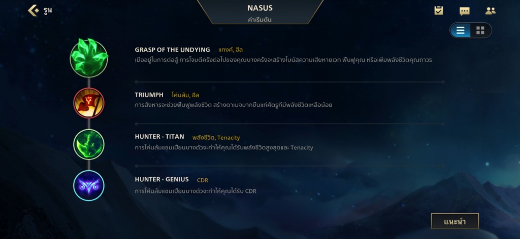ในส่วนนี้ รูน Domination จะใช้เป็น Triumph เพราะว่า Nasus เป็นตัวที่ดาเมจช่วงเลทเกมรุนแรงมาก และออกของเน้น Tank ดังนั้นเมื่อสังหาร Champion ฝั่งตรงข้ามได้ จะได้ HP เพิ่มขึ้นมาระดับนึง ทำให้สามารถเข้าทีมไฝว์ได้อย่างต่อเนื่อง