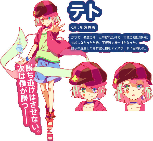 เทพเจ้าแห่งเกม ผู้รอดพ้นจากสงครามระหว่างเทพ ด้วยการปฏิเสธการต่อสู้ จึงได้สร้างโลกของตัวเองขึ้นมา พร้อมกับตั้งกฏทั้ง 10 ข้อขึ้น เพื่อปกครองโลกแห่งเกมกระดาน หรือที่เรียกว่า “ดิสบอร์ด” ที่ชิโระและโซระหลุดเข้าไปนั่นเอง