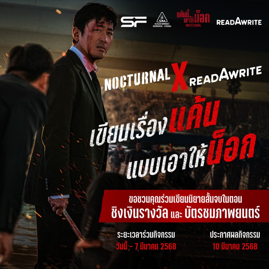 “มงคลซีนีม่า” ร่วมกับ “readAwrite” และ “SF Cinema” ขอชวนนักเขียนทุกท่านสร้างสรรค์ผลงานระบายความแค้นลงบนตัวอักษร โดยการเข้าร่วมกิจกรรมประกวดแข่งขันแต่งนิยายเรื่องสั้นตอนเดียวจบแนวแอ็กชันล้างแค้น-อาชญากรรม-สืบสวนสอบสวน ภายใต้คอนเซปต์ “เขียนเรื่องแค้นแบบเอาให้น็อก” โดยอ้างอิงจากพล็อตเรื่องและชื่อตัวละครจากภาพยนตร์เรื่อง “Nocturnal แค้นนี้เอาให้น็อก” ให้ออกมาเป็นเรื่องราวในแบบของตัวเอง ชิงเงินรางวัลและบัตรรับชมภาพยนตร์ในเครือ SF Cinema รวมมูลค่า 25,000 บาท