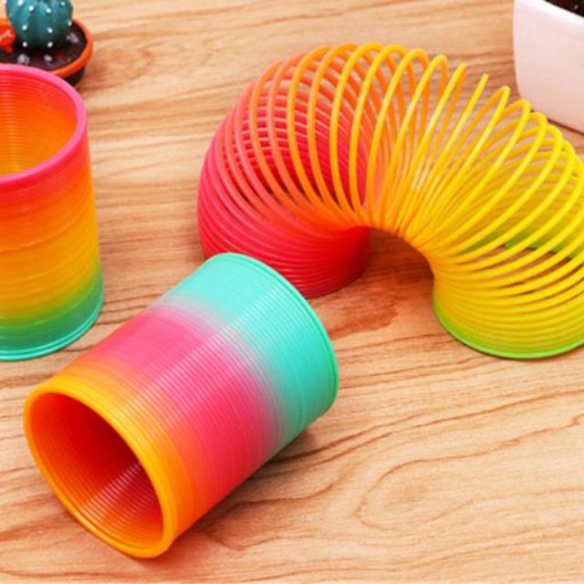 เริ่มจากของเล่นที่ “ง่อย” ที่สุดในความทรงจำแอดมินก่อนเลย 55+ มันคือของเล่นที่เบสิคมากๆ สปริงสีพลาสติกเหล่านี้มีมาให้เล่นกันมานานตั้งแต่ยุค 80 เราสามารถพบเจอมันได้ตามแผงลอย ตลาดนัด แผงขนมหน้าโรงเรียน มีตั้งแต่ไซส์เล็กหลัก 5 บาท ไปจนถึงไซส์ใหญ่ หลักร้อยบาท ส่วนมาก สปริงสีรุ้งนี่จะแถมมากับพวกจัดโปรซื้อรองเท้านักเรียนอนุบาล+ถุงเท้า ซื้อคู่แล้วต้องไปแลกซื้อไอ้สปริงนี่มาด้วยนะ แต่เชื่อเถอะ เด็กๆตัวน้อยๆ คงชอบแหละ สีสันสวยฉูดฉาดบาดตามาก วิธีเล่น โยนมันลงบันได มันจะเทคตัวไปตามชั้นบันไดทีละชั้นๆ อาศัยโมเมนตั้มจากหัวไปท้าย ท้ายไปหัว สลับกันจนไต่บันไดลงมาได้นั่นเอง