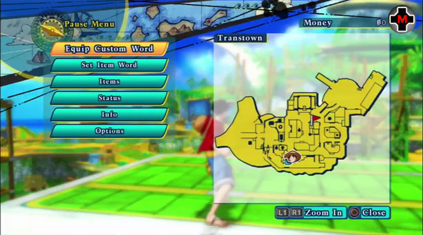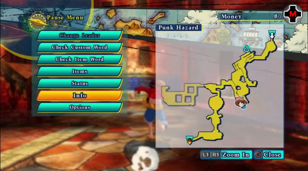 เมื่อถึงฝั่งทุกคนต่างแยกย้ายไปทำหน้าที่ ซันจิบรูคไปหาสเบียง อุซปแฟรงกี้ซ่อมแซมเรือ ชอปเปอร์หายา โซโลจอมหลงทางให้เฝ้าเรือ นามิกับโรบินจะไปช๊อปปิ้ง ส่วนลูฟี่ที่ไม่รอฟังคำสั่งกระโดดออกจากเรือเพื่อไปหาของกินอร่อยก่อนใครเพื่อน เริ่มเล่นบังคับตัวละครลูฟี่ ก่อนอื่นให้ไปที่ Inn เปิดเมนูมาดูแผนที่สังเกตุธง ให้ไปตรงนั้นเลย