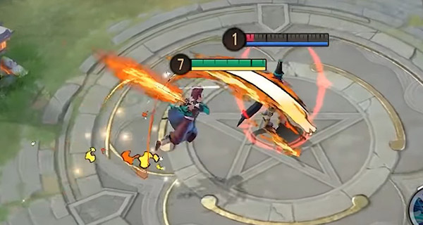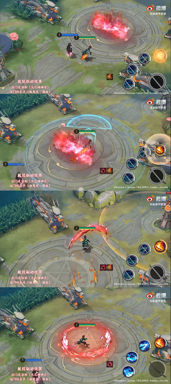 เอฟเฟกต์สกิลเสริม: หากทันจิโร่ใช้สกิลนี้ร่วมกับท่า “มนต์อสูรโลหิต” ของ เนซึโกะ ก็จะเกิดเอฟเฟ็กต์ไฟสีชมพู การฟันครั้งต่อๆไป จะเพิ่มการทำลายเกราะ สร้าง True Damage และทำให้ศัตรูในระยะช้าลงทุกวินาที จนกว่าผลของสกิลเนซึโกะจะหมดลง