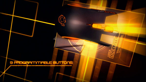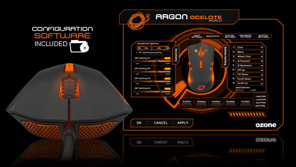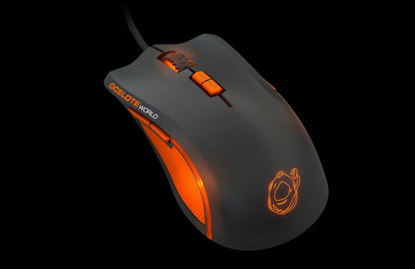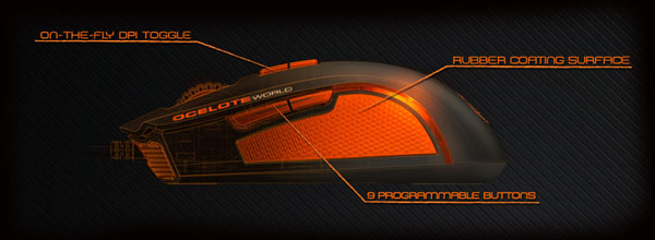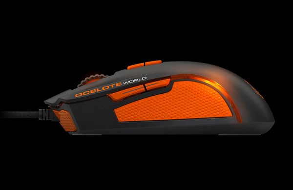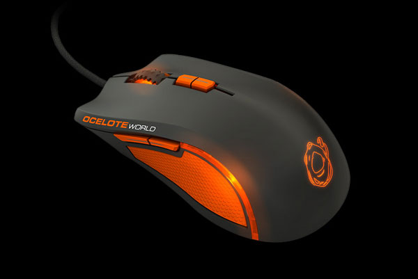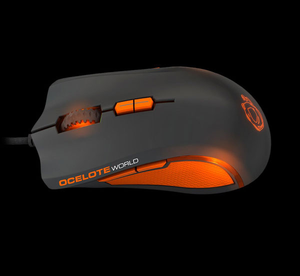 ส่วนดีไซน์ของเจ้าเม้าส์ ARGON Ocelote ตัวนี้ เริ่มจากตัวสายเป็นสายถักหัวเชื่อมต่อเป็นแบบหัวเสียบ USB ด้านท้ายขางตัวเม้าส์จะมี Logo Ozone มีไฟด้านซ้าย และด้านขวา สามารถใช้ได้ทั้งสองมืออย่างที่ได้บอกกันไป ที่ปุ่มคลิกซ้ายจะมีชื่อ Ocelote World ปั๊มติดอยู่ โดยที่สวิตช์คลิกใช้เป็น Omron ด้านข้างทั้งฝั่งซ้ายและขวามีปุ่ม 2 ปุ่ม สามารถกด Backward Forward ได้