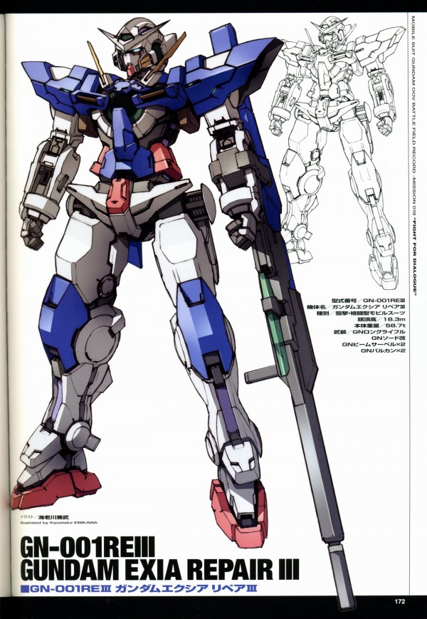 GN-001REIII Gundam Exia Repair III (Exia R3) เป็นร่างซ่อมแซมและอัพเกรดของ GundamExia Repair II ที่ปรากฏตัวในตอนจบของภาค Gundam OO ในการต่อสู้ครั้งสุดท้ายนั่นเอง แต่ว่าเจ้าตัว R3 นี้ไม่ได้ปรากฏตัวในอนิเมชั่นแต่อย่างใด R3 ได้ปรากฏตัวครั้งแรกใน Gundam OOV : Battlefield Record ซึ่งเป็น graphic novel ที่ตีพิมพ์ลงในนิตยสาร Hobby Japan