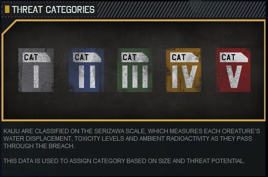ไคจู เป็นสัตว์ที่มีคุณลักษณะเป็นพิษสูงและได้รับการจัดระดับโดยใช้มาตราวัดที่เรียกว่า “Serizawa Scale” (เซริซาว่าสเกล – เป็นการล้อเลียนชื่อของ ดร.เซริซาวะ จากหนังก็อดซิลล่า) โดยเรียงจากระดับอ่อนสุด หรือระดับ 1 ไปหาเก่งสุด หรือระดับ 5 ตามลำดับ หรือบางครั้งก็จะถูกนำมาใช้วัดขนาดด้วย