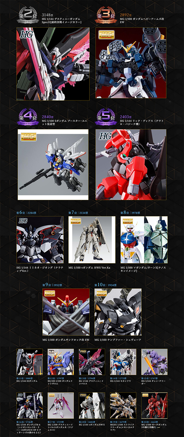 สำหรับอันดับ 4–10 ยังคงเต็มไปด้วยกันพลาเกรด MG และ HG เวอร์ชันพิเศษและโมเดลขนาดใหญ่ ไม่ว่าจะเป็น MG S Gundam Booster Unit Type, HG Rick Dias (Quattro Bajeena Custom), HG II Neo Zeong (Narrative Ver.), และ MG Nu Gundam HWS Ver.Ka ซึ่งสะท้อนแนวโน้มความนิยมของผู้โหวตที่ให้ความสำคัญกับโมเดลที่มีเอกลักษณ์เฉพาะตัว แตกต่างจากไลน์จำหน่ายปกติ และมักมีรอบการผลิตจำกัด