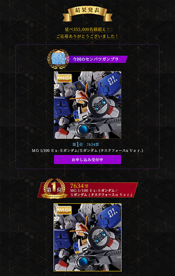 ผลการโหวตปรากฏว่าอันดับ 1 ได้แก่ MG 1/100 Ex-S Gundam / S Gundam (Task Force Alpha Ver.) ด้วยคะแนนโหวตสูงถึง 7,634 คะแนน ทิ้งห่างอันดับ 2 อย่างชัดเจน และสะท้อนความต้องการของแฟนๆกันพลากระเป๋าหนักอย่างชัดเจนต่อโมเดลสาย Gundam Sentinel ที่มีชื่อเสียงด้านความซับซ้อนของโครงสร้าง ดีไซน์ที่มีรายละเอียดสูง และขนาดตัวที่ใหญ่ในระดับ Master Grade โดยเวอร์ชัน Task Force Alpha ถือเป็นหนึ่งในรุ่นที่หาได้ยากและถูกกล่าวถึงมาอย่างยาวนานในหมู่นักสะสม