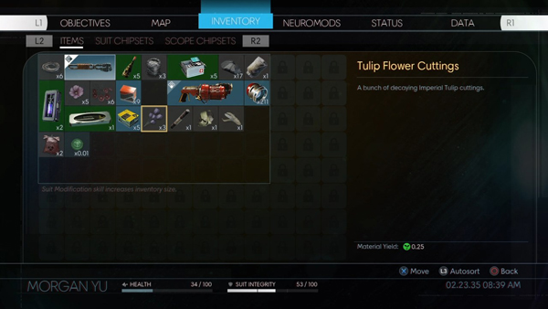 การสร้างไอเทมภายในเกม จะเป็นการเอาซากได้จากการดรอปศพเอเลี่ยน ไปย่อยเป็นวัตถุดิบผ่านเครื่องย่อย แล้วเอาวัตถุดิบไปย่อยเป็น Neuromods ด้วยเครื่องคราฟท์Mod อีกที เพื่ออัพสกิล หรือจะเอาไปคราฟท์เป็นไอเทมผ่านเครื่องคราฟท์ไอเทมก็สามารถทำได้ ซึ่งในช่วงแรกๆ เราจะเจอเครื่องคราฟท์พังๆ เราก็ต้องซ่อมก่อนใช้งาน ในส่วนนี้แลดูวุ่นวายใช้ได้เลย ไม่รู้จะทำให้ซับซ้อนอะไรมากมาย