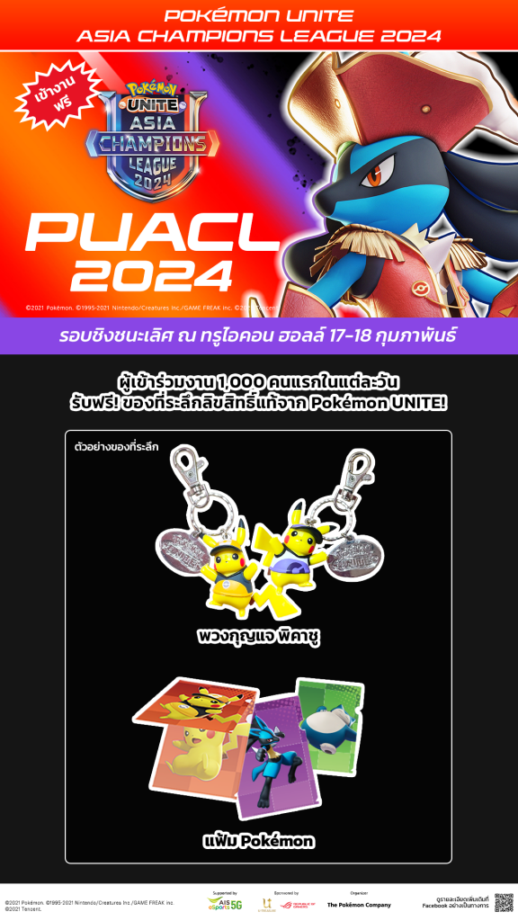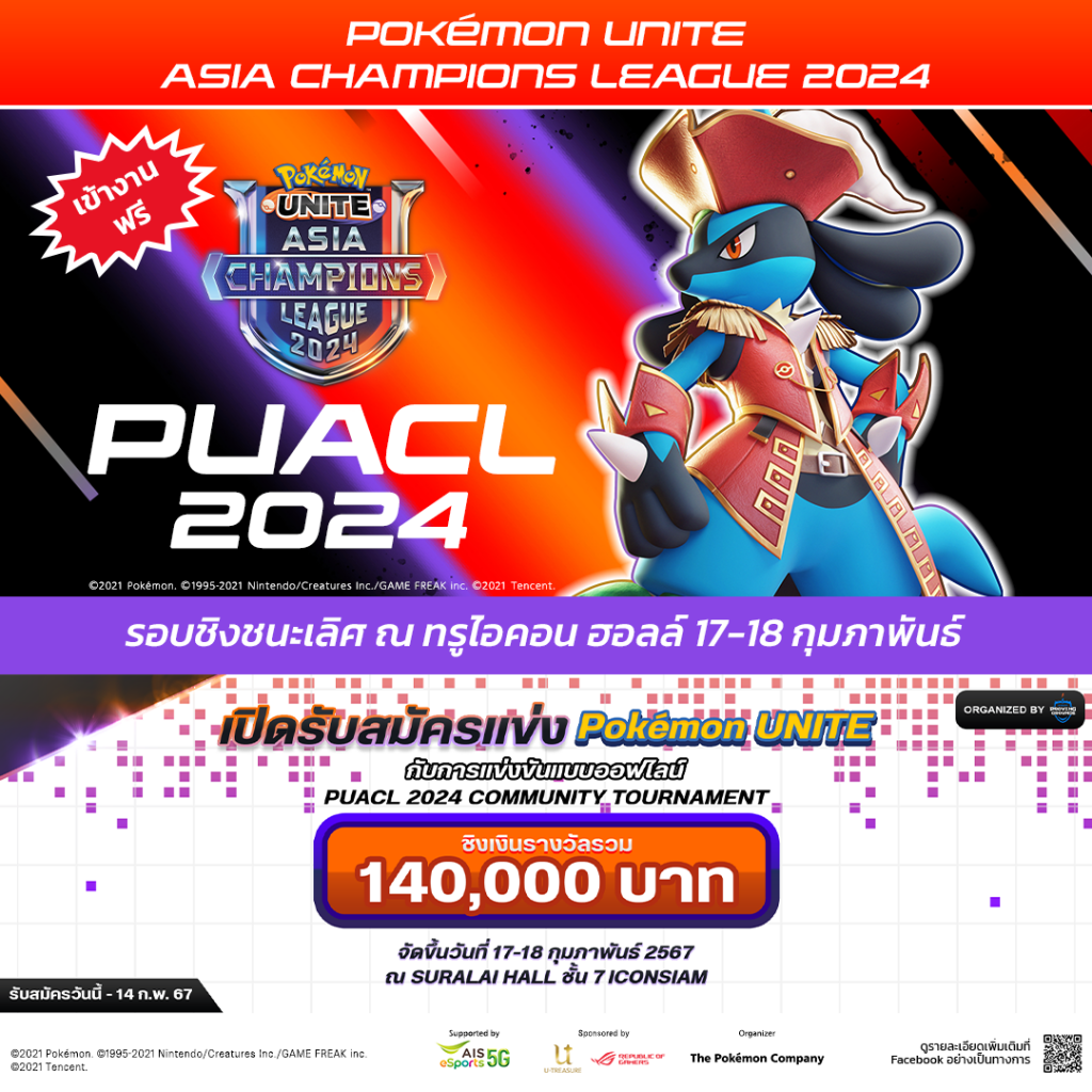 The Pokémon Company เตรียมพร้อมสำหรับการแข่งขันรอบชิงชนะเลิศ Pokémon UNITE Asia Champions League 2024 หรือมีชื่อย่อว่า “PUACL 2024” ซึ่งเป็นการแข่งขันเกม Pokémon UNITE ระดับนานาชาติชิงแชมป์ระดับภูมิภาคเอเชีย โดยจะจัดขึ้น ณ ทรู ไอคอน ฮอลล์ ชั้น 7ศูนย์การค้าไอคอนสยาม กรุงเทพมหานคร ในวันที่ 17 (ส.) และ 18 (อา.) กุมภาพันธ์ 2024