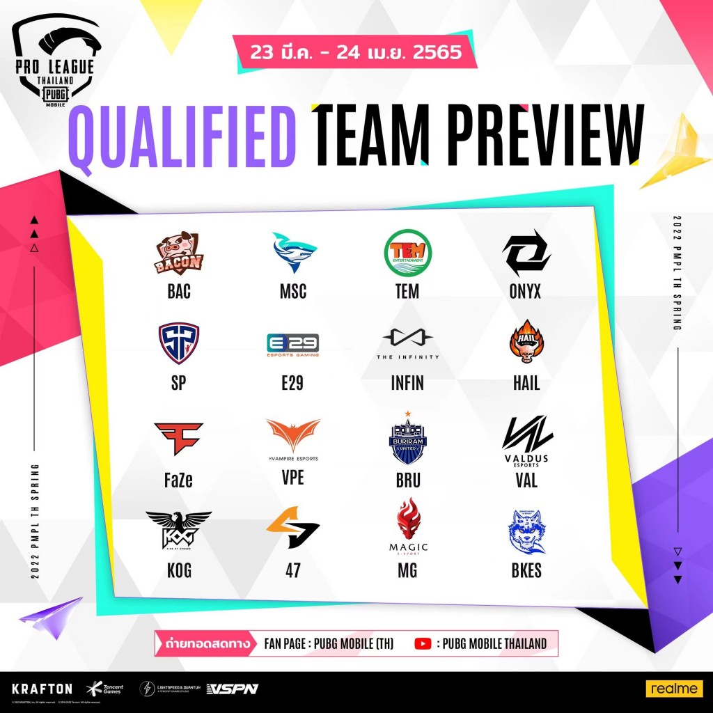 การต่อสู้บนสมรภูมิอันดุเดือดได้ปะทุขึ้นอีกครั้ง พบกับ 20 ทีม ที่เข้าร่วมชิงความเป็นหนึ่งในลีกสูงสุดของประเทศไทย รายการ PUBG MOBILE PRO LEAGUE THAILAND SPRING 2022 (2022 PMPL TH SPRING) ซึ่งมีเงินรางวัลรวมสูงถึง 3,300,00 บาท จัดขึ้นโดย Tencent Games และ VSPN ร่วมมือกับ realme แบรนด์สมาร์ทโฟนระดับโลก