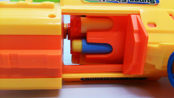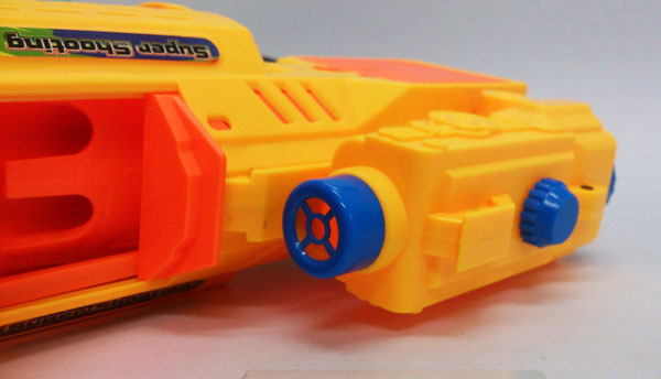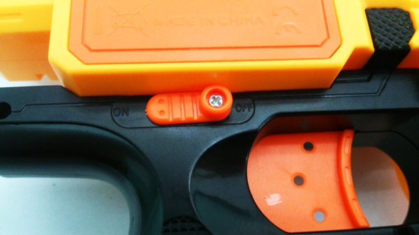 ด้านข้างขวาของปืน ด้านบนเป็นที่สำหรับเอาไว้ใส่ถ่าน ซึ่งเจ้าปืนตัวนี้ ใช้ถ่านขนาด AA จำนวน 3 ก้อนด้วยกัน ถัดลงมาเป็นสวิทซ์เปิด/ปิด การทำงานของปืนนั้นเอง