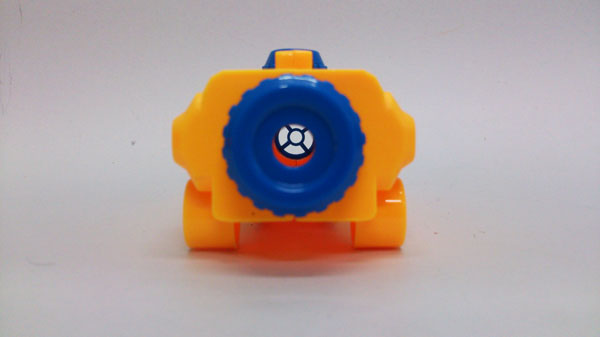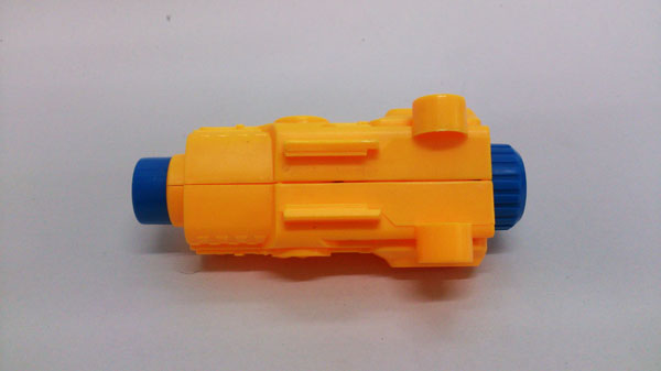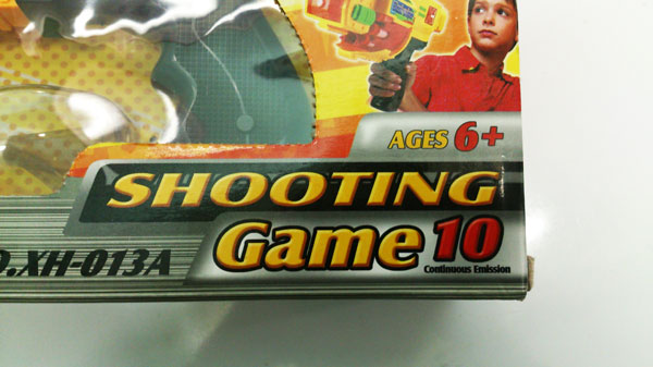 ดูจากกล่องภายนอกก็ดูว่าสีสันจะจัดจ้านอยู่พอสมควร ด้านหน้าก็จะเห็นว่าแพ็คมาเป็นอย่างดีเลย ด้านหลังมีรูปเด็กหัวทองกำลังเล่นเจ้าปืนนี้อยู่พอดี ท่าทางน่าจะมันส์นะครับ ด้านล่าง 4 ช่องเล็กมีบอกวิธีการใส่กระสุน การใส่ถ่าน การเปิด/ปิดสวิทซ์ และการยิง